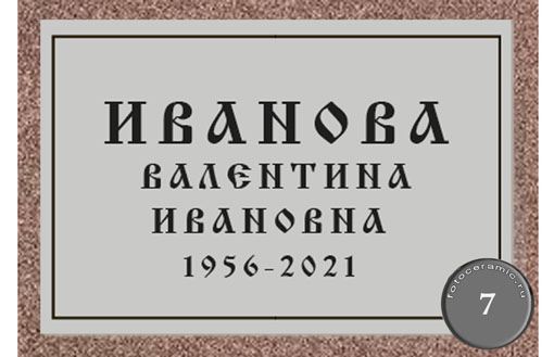 Табличка – неотъемлемый элемент для намогильного памятника. Она сообщает информацию о захопронении. Табличка выполненная по техннологии термопечать, может быть частью надгробной плиты или креста установленного на могильном холме. Как правило такие пластины имеют форму прямоугольника, но бывают и исключения. Такая табличка имеет средний срок службы, но ее отличие заключатеся в том, что за небольшие деньги можно сделать красивый мемориальный трафарет до тех пор, пока Вы не установите постоянную надгробную плиту.
