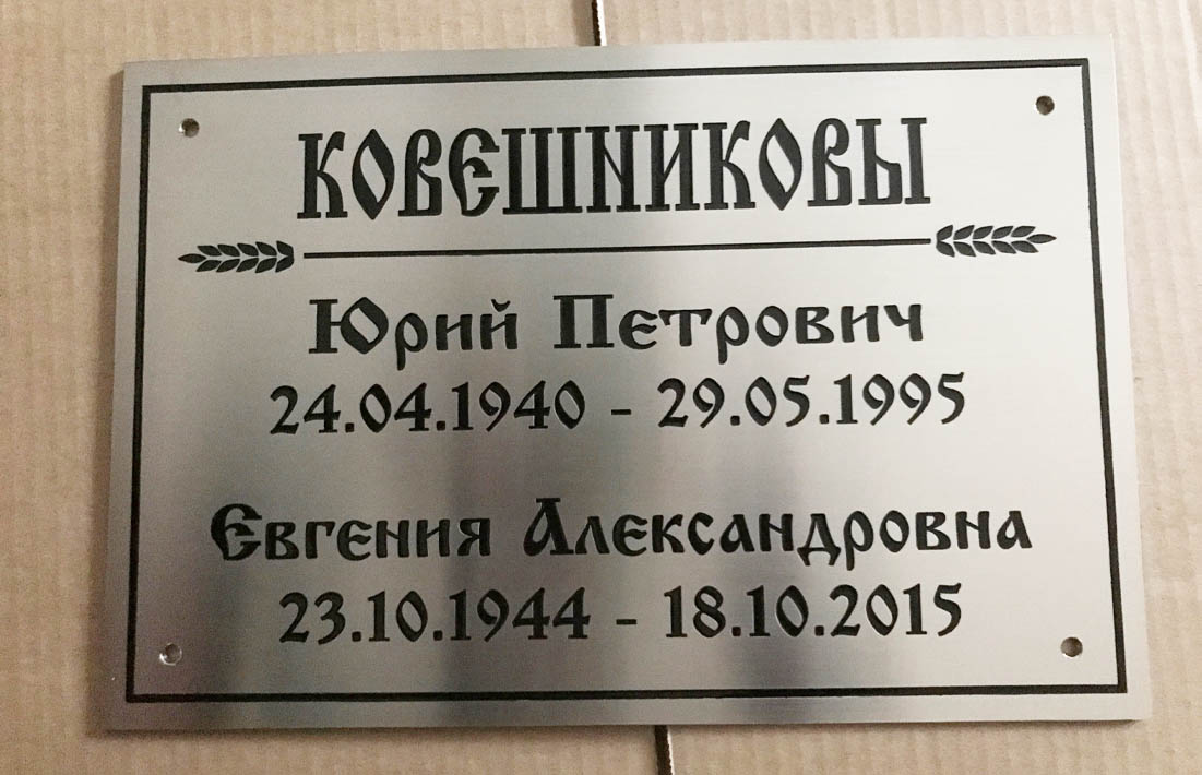 Таблички из бронзы со временем, находясь на открытом воздухе окисляются и преобретают налет благродной патины и незначительно темнеют. Латунные изделия внешне похожи на играющее золото в солнечных лучах. Выгравированные буквы заполняются эмалбю черного цвета.